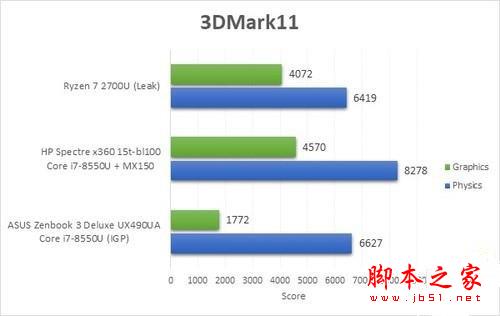 Ryzen 7 2700U 3DMark 11图形跑分得到了4072,相比于目前笔记本上流行的NVIDIA GeForce MX150独立显卡只低了10%多一点,同时是Intel八代酷睿核显的几乎三倍。